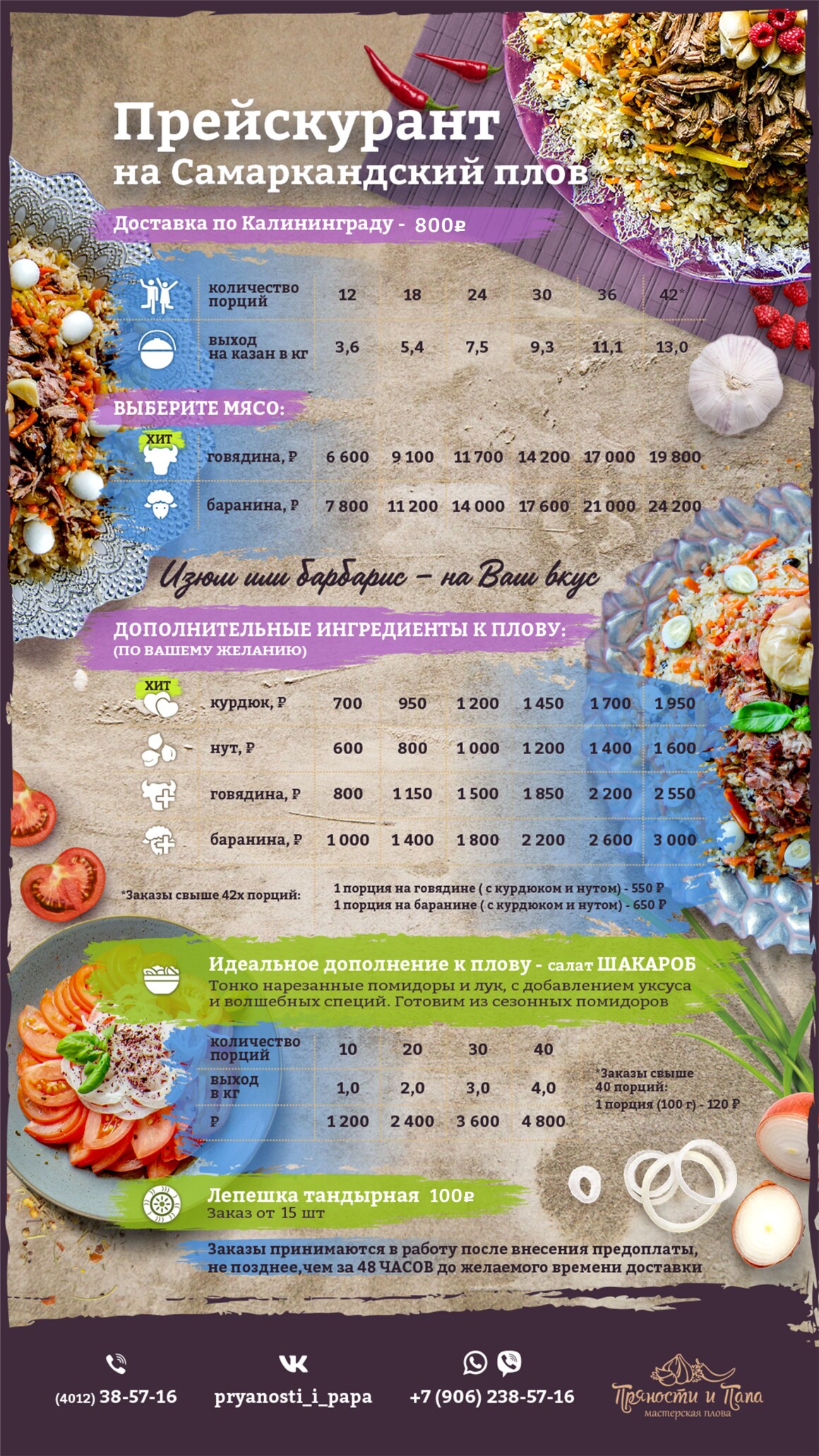 Напишите или позвоните нашему менеджеру и мы подберём формат и рецепт плова, оптимально подходящий под Ваш коллектив и бюджет