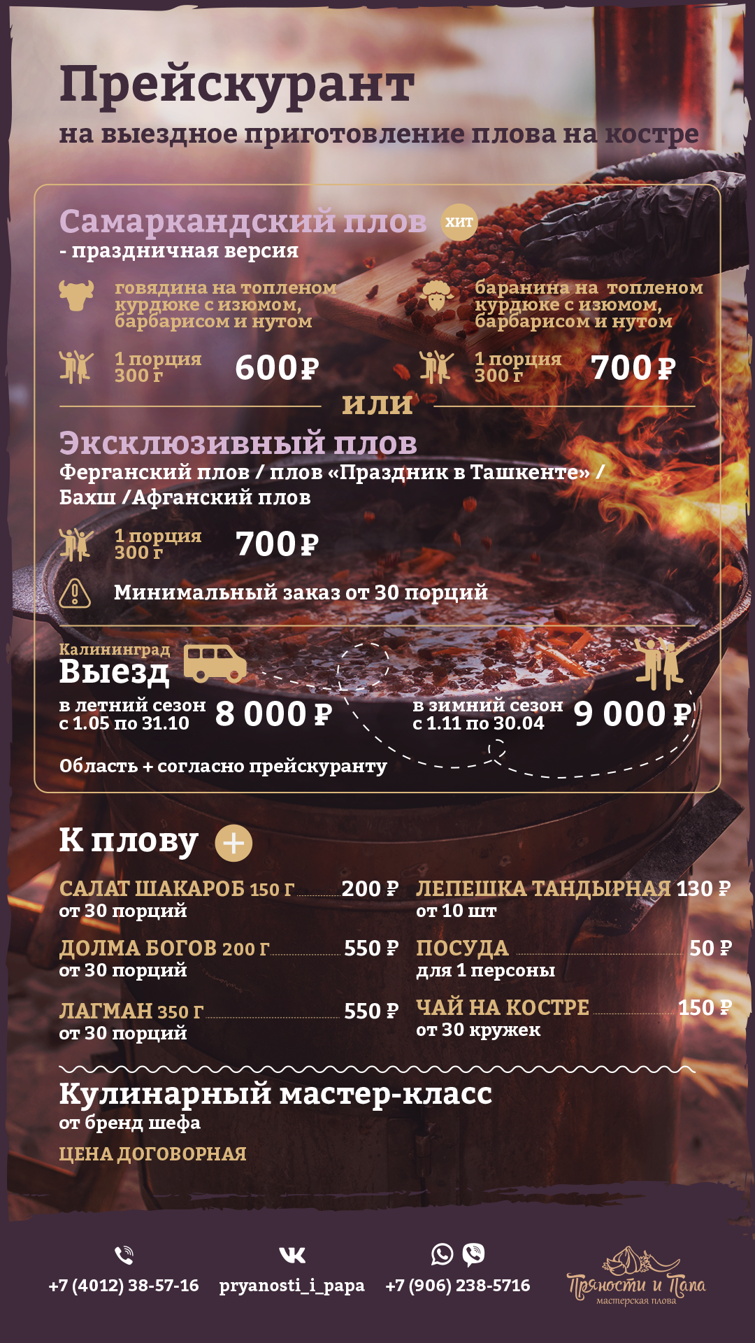 "Пряности и Папа" предлагает вам идеальное сочетание, способное решить проблему тяжелого выбора и хлопот: плов приготовленный из свежайшего мяса на костре!
